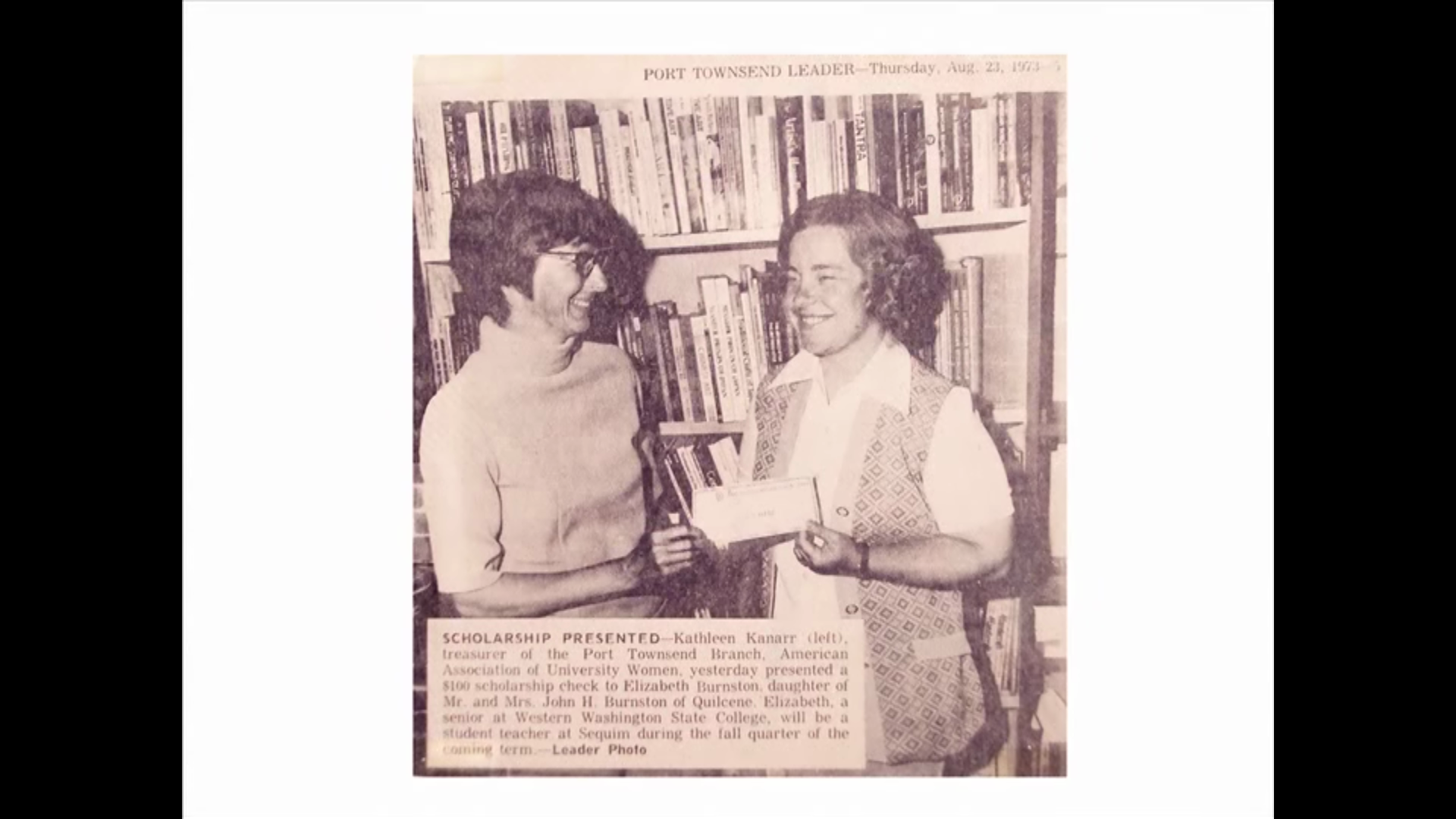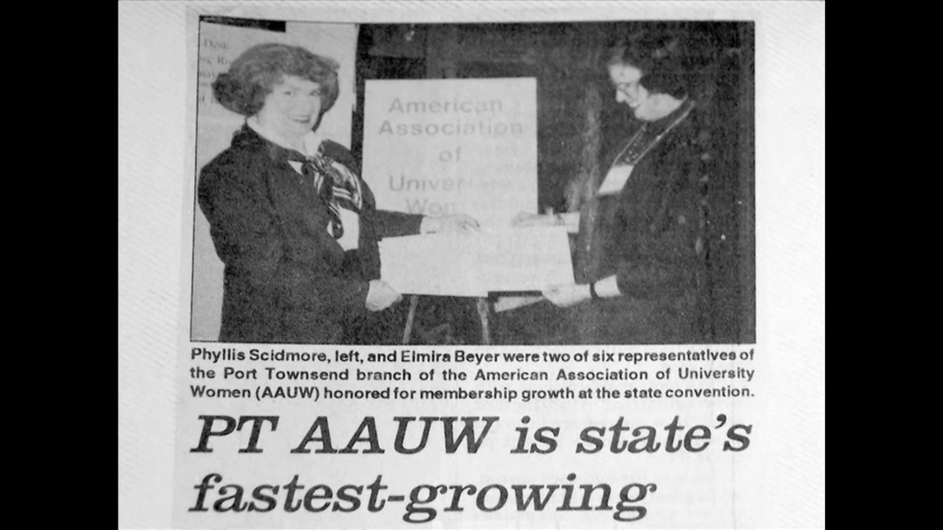 In 1948, Edith Miller and Dorothy Meyers and about 35 other women founded the Port Townsend branch of AAUW. They got busy right away, raising awareness and bringing culture to the area. In that first year they started a preschool, sponsored a Girl Scout troop and brought culture to Port Townsend with an art exhibit from the Seattle Art Museum and a play from University of Washington. They also raised money to sponsor a local theater group that ultimately became Key City Players 20 years later. They also supported a summer school for the arts at Fort Worden, helping pave they way for what we now know as Centrum.